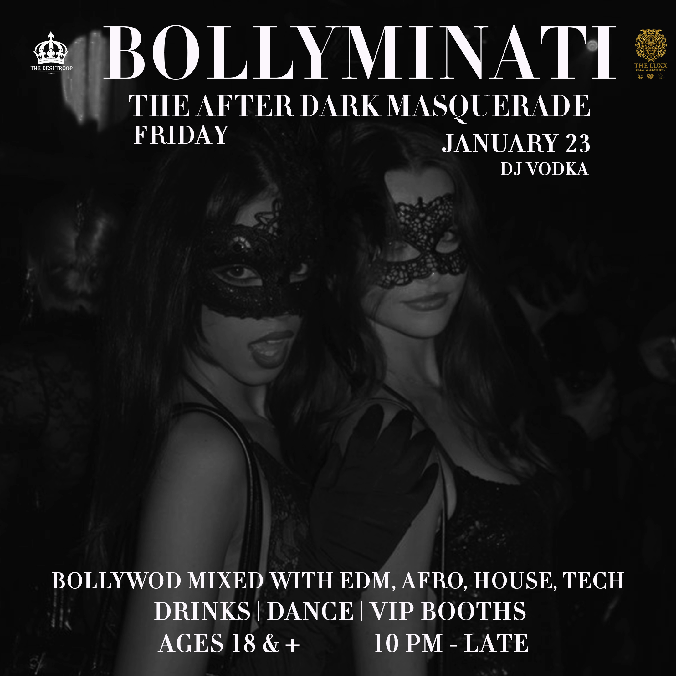 On January 23, The Desi Troop Events brings Bollyminati to The Luxx, Edmonton — a late-night masquerade made for the ones who like their Bollywood a little darker, louder, and dangerously addictive.